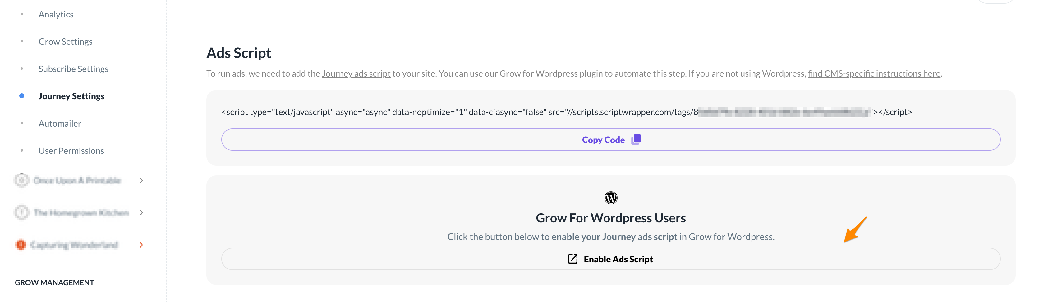 Hi Julie!  We can confirm the ad script is on your site and there are no obvious conflicts at play.  It just looks as if the script hasn't been enabled yet.  Could you go to the Journey Settings section of your Grow dashboard and click Enable Ads Script again and follow the prompts?