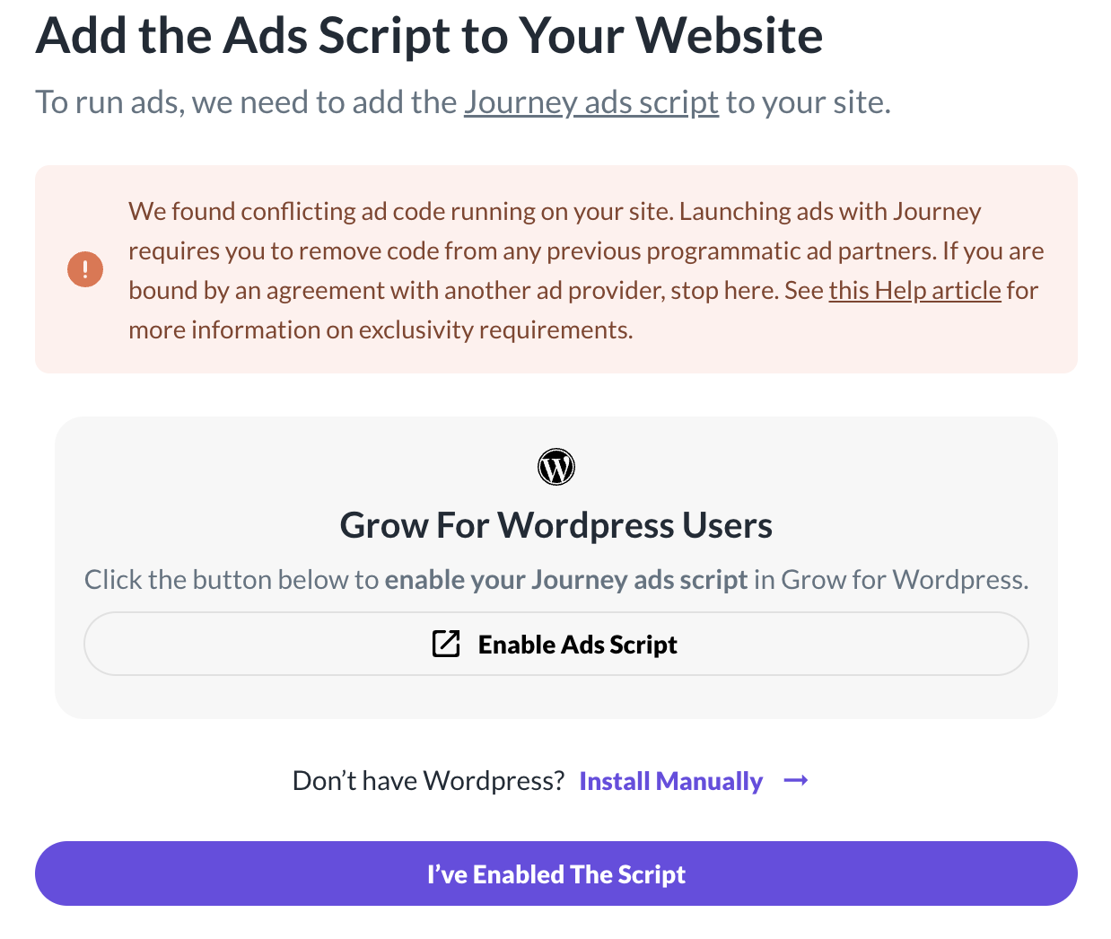 Gloria Barr We're still seeing Ezoic ads running on your site, which will need to be removed before running Journey ads. Here's an article that goes through how to remove Ezoic from your site, and if you need any additional assistance removing the ads, you would just want to reach out to Ezoic's support team!