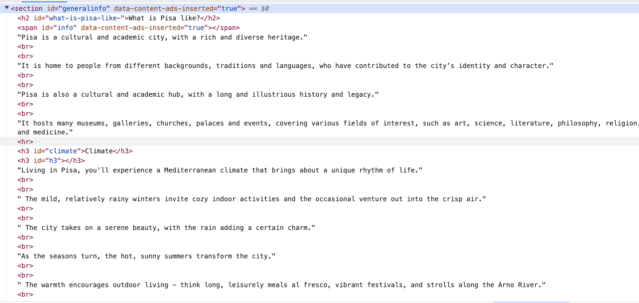 You can see there aren't any separate elements, so I believe our script isn't able to figure out where one paragraph or piece of content ends and the next begins.