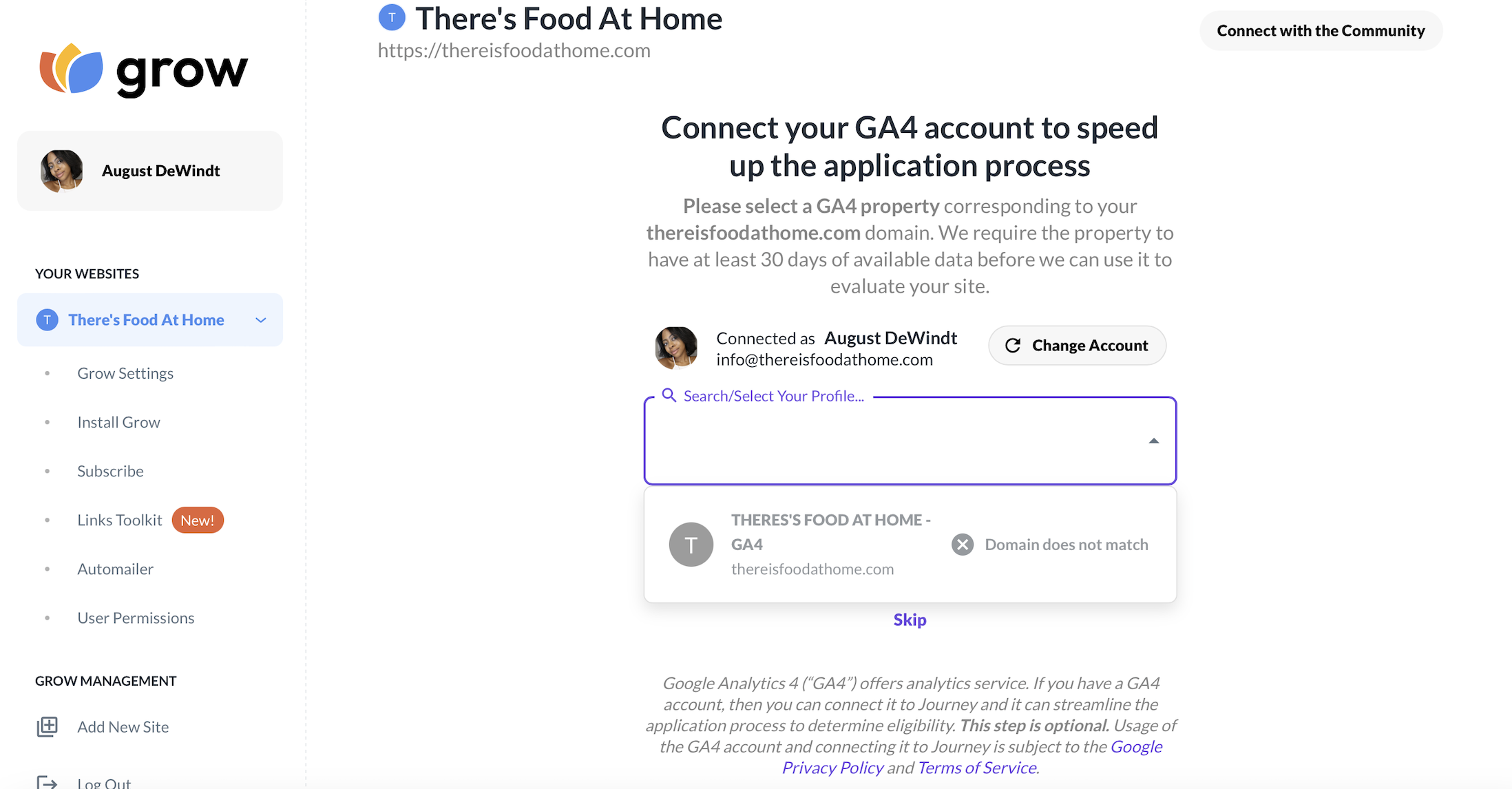 Hi Ryan, I wasn't able to figure it out so I skipped this step and went to the “add about” page. I was able to add the grow plug in on my website and I have it toggled to access google analytics.