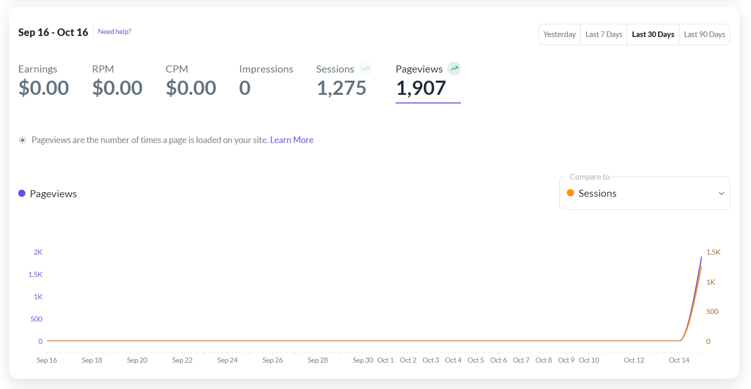 I recently launched ads on my website, and while the Grow dashboard displays accurate numbers of sessions and pageviews, it shows a flatline of 0 for ad revenue and impressions. Is this normal, or is there an issue?