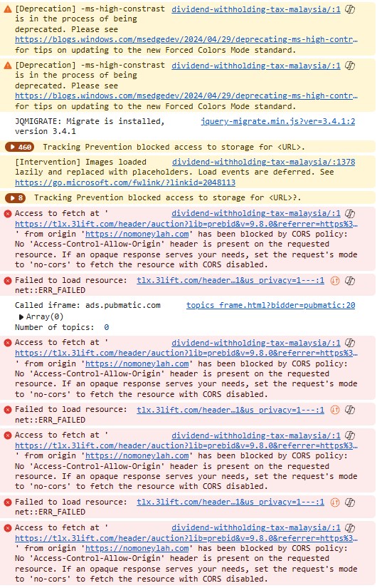 Access to fetch at 'https://tlx.3lift.com/header/auction?lib=prebid&v=9.8.0&referrer=https%3A%2…2F10%2F30%2Fdividend-withholding-tax-malaysia%2F&tmax=2801&us_privacy=1---' from origin 'https://nomoneylah.com' has been blocked by CORS policy: No 'Access-Control-Allow-Origin' header is present on the requested resource. If an opaque response serves your needs, set the request's mode to 'no-cors' to fetch the resource with CORS disabled.