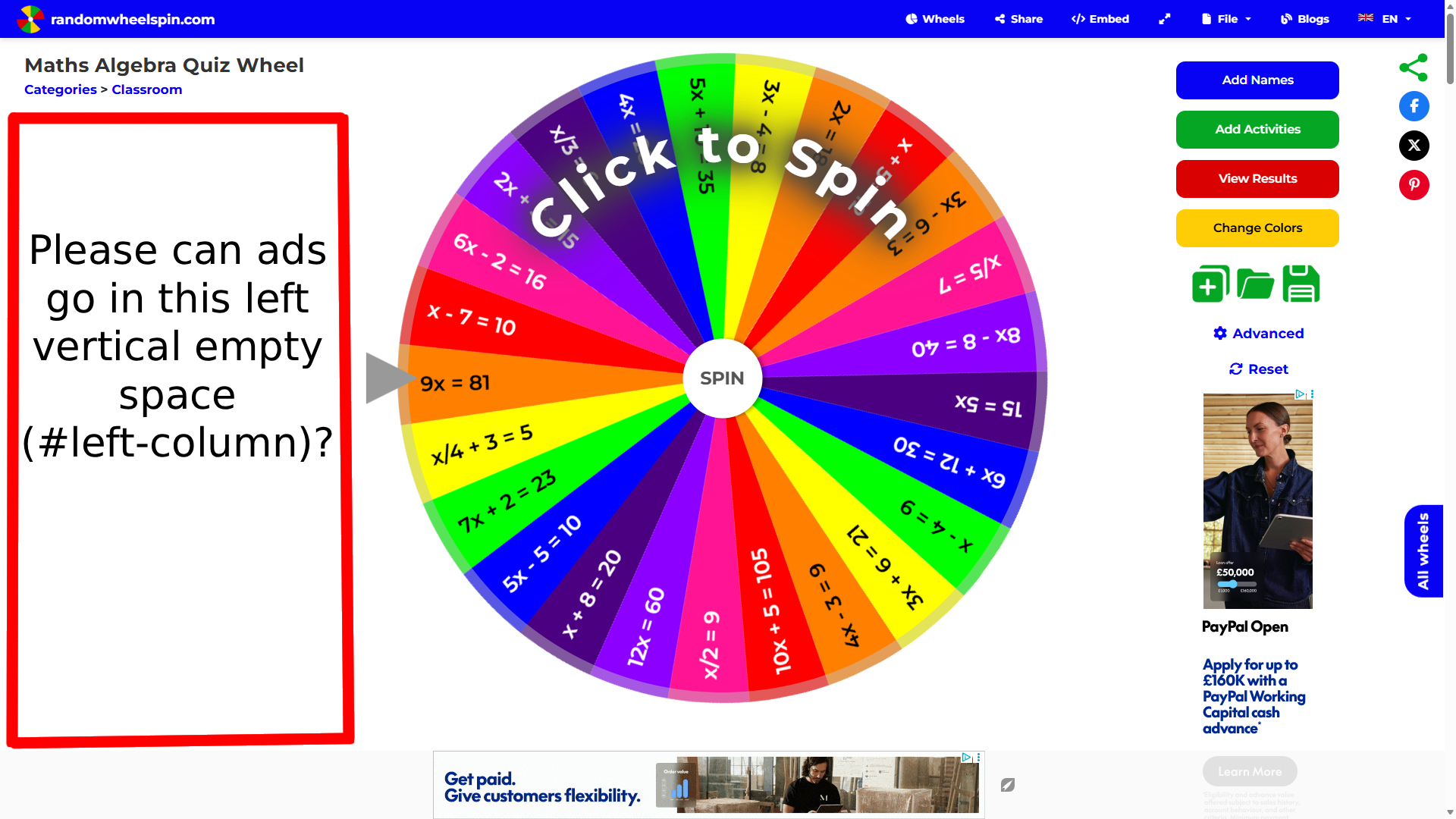 I still have a problem (or it may be a setting that needs enabling your end): the side-bar ads are only appearing on the right of my screen when I have a much larger amount of vertical empty space on the left of every page of my site - in a vertical container with ID “#left-column”, minimum width of 300px. Is it possible please to have sidebar ads (or any ads) appearing in #left-column please? My site for reference is https://randomwheelspin.com