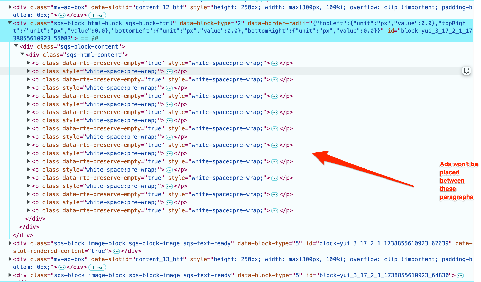 One thing to keep in mind when constructing a post is that our script is targeting the container holding all the individual blocks that make up the post to place ads. It will optimally place ads around the blocks, but it won't place ads inside of the blocks. So the longer the individual blocks are, the longer the section of the page will be without ads.