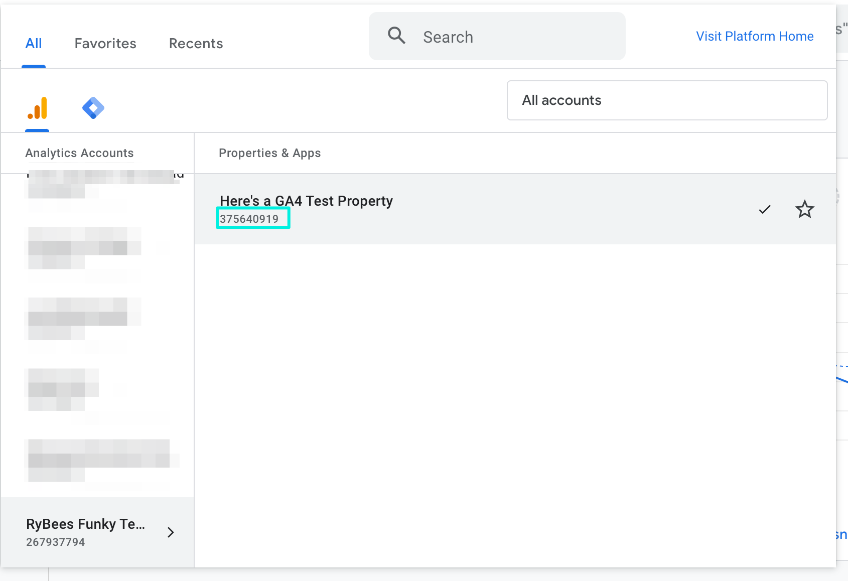 This information can be found in Google Analytics by Navigating to the Google Analytics property selector found at the top of the page after logging in to Google Analytics (This should read as the name of your property), followed by navigating to the analytics account associated with your site. The property ID is found under ‘Properties & Apps’