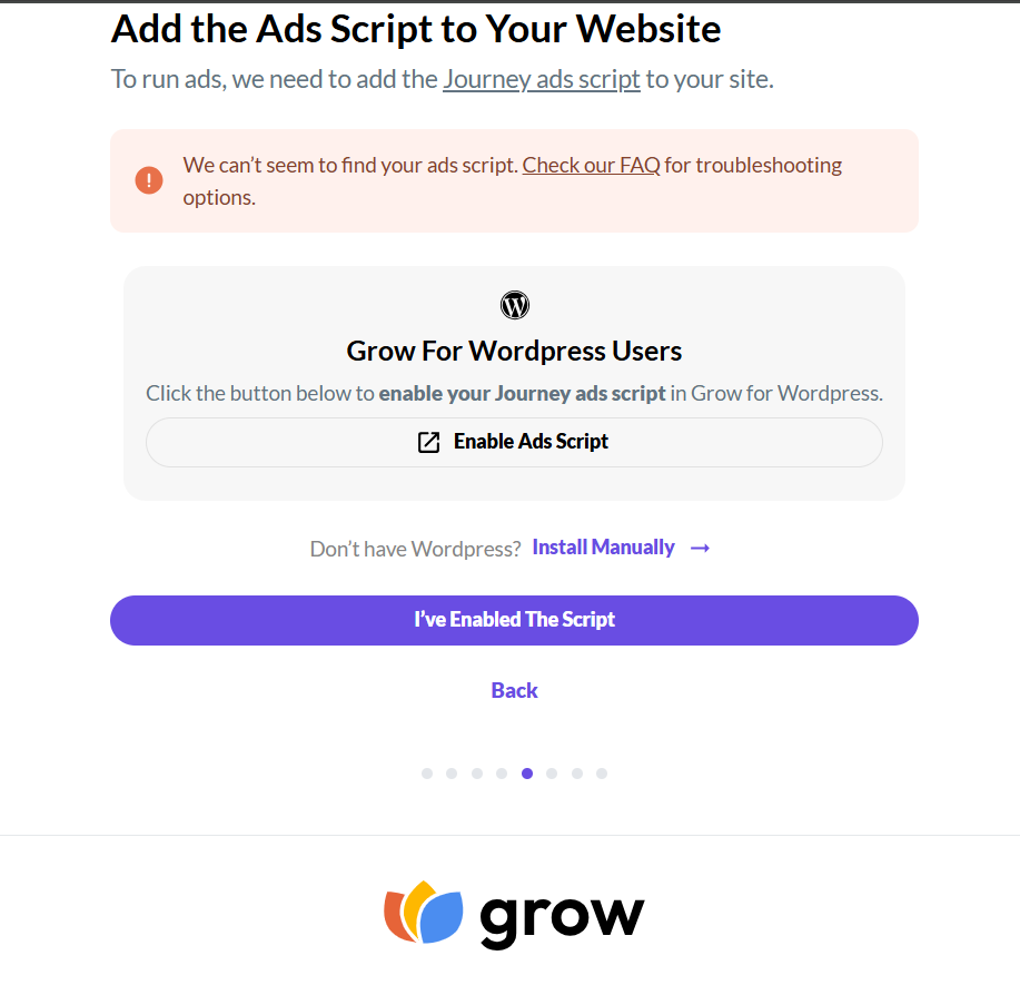 The error message I’m seeing is: "We can’t seem to find your ads script. Check our FAQ for troubleshooting options." I have already ensured that both the browser and site caches are clear, and I’ve confirmed that no plugins are collapsing. Additionally, I have double-checked that the code integrations on my site are correct, yet I am still facing this issue.