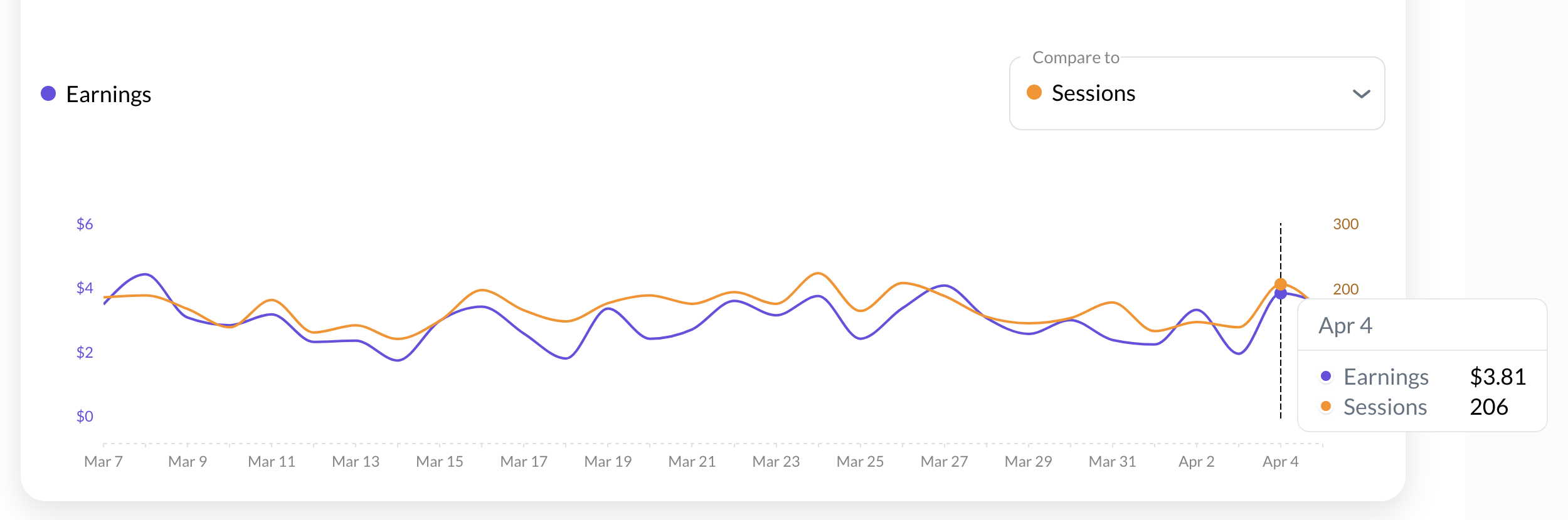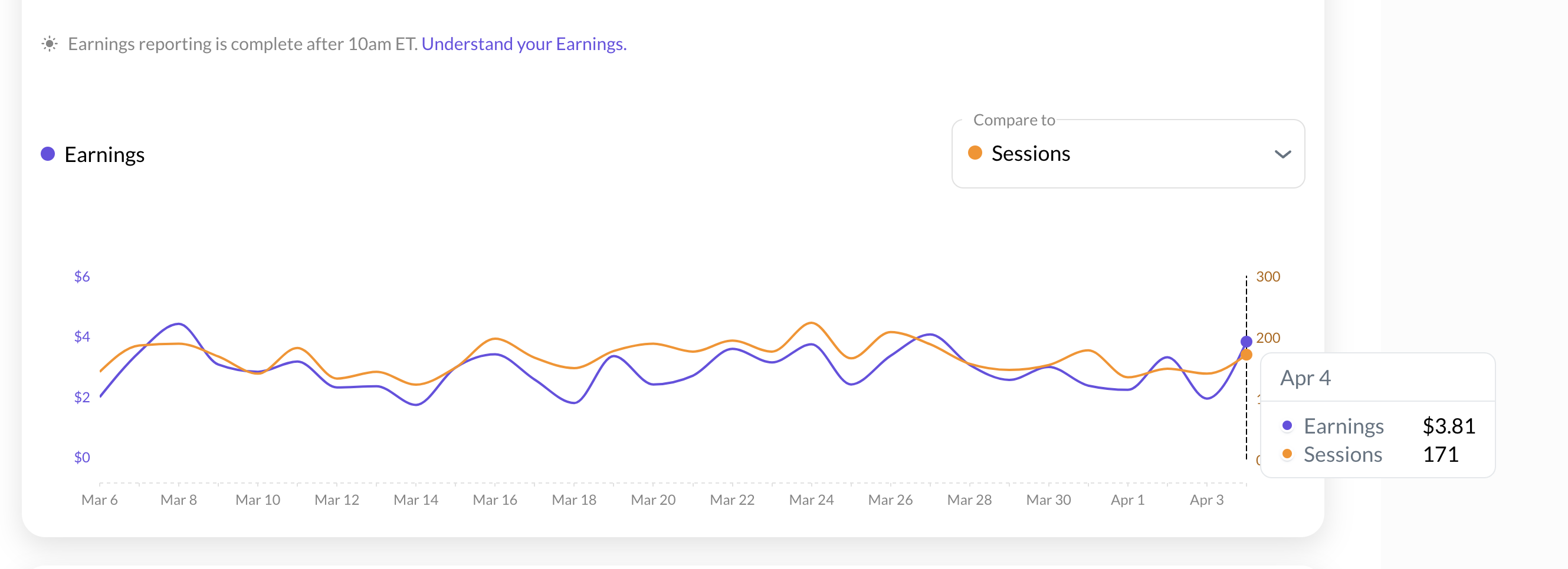 Each morning, the previous day's GA4 sessions and earnings appear in my dashboard. However, as the day goes on, the session count for the previous day increases, but the total earnings for that day remain the same—they don’t reflect the updated session count.