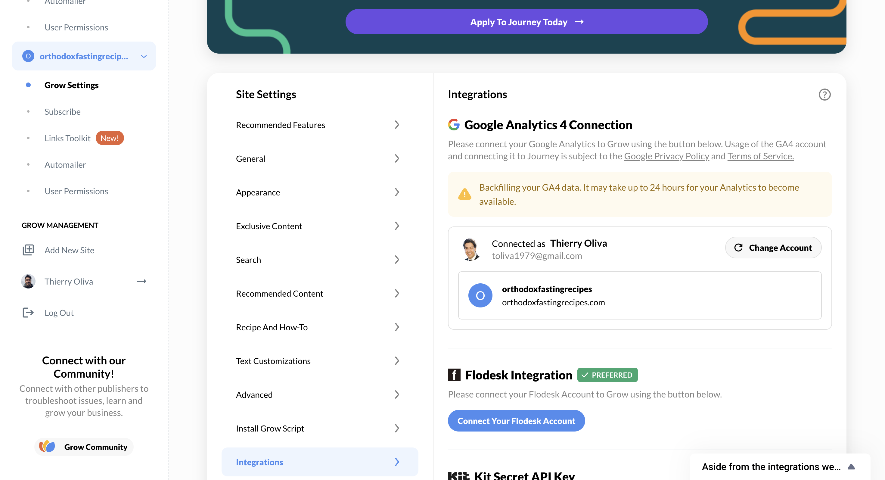 Hey Thierry - I'm seeing a properly synced Google Analytics account on your Grow Dashboard. If you're still seeing the same warning, you may want to log out and back in.