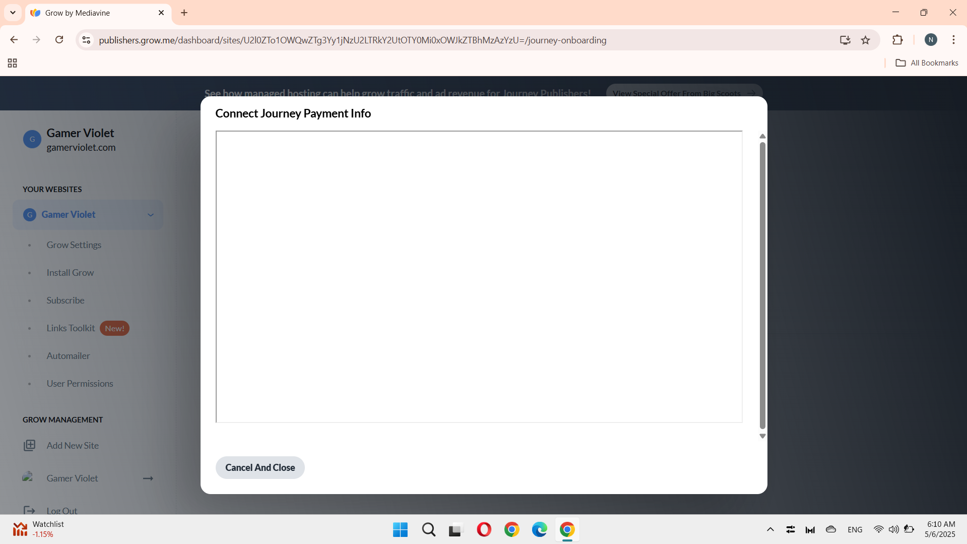 I have been approved for Journey and am trying to connect my payment information. However, when I click the “Connect Journey Payment Info” button, I only see a blank screen (screenshot attached). I have tried: