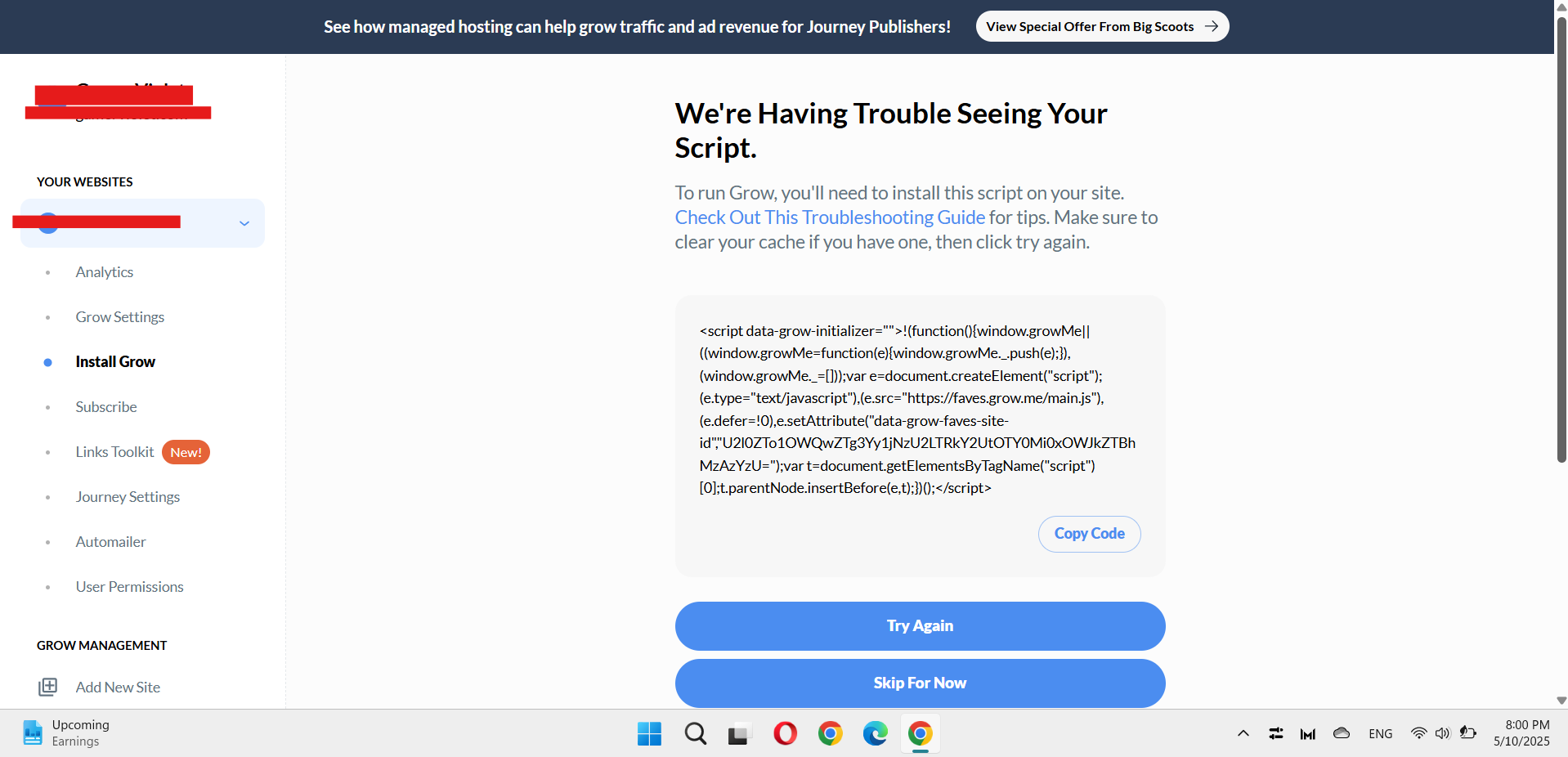 I am having trouble getting the Grow script to work on my website. I keep seeing the error: "We're Having Trouble Seeing Your Script."