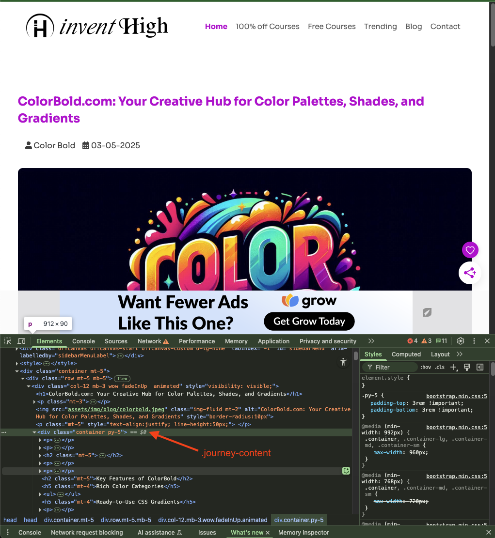 I’ve now added the journey-content class to the main container that wraps the post content on my site. Here's what it looks like: