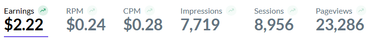 I’ve attached my latest screenshot. As you can see, impressions and earnings are still extremely low compared to the sessions and pageviews — which suggests ads still aren’t actually showing.