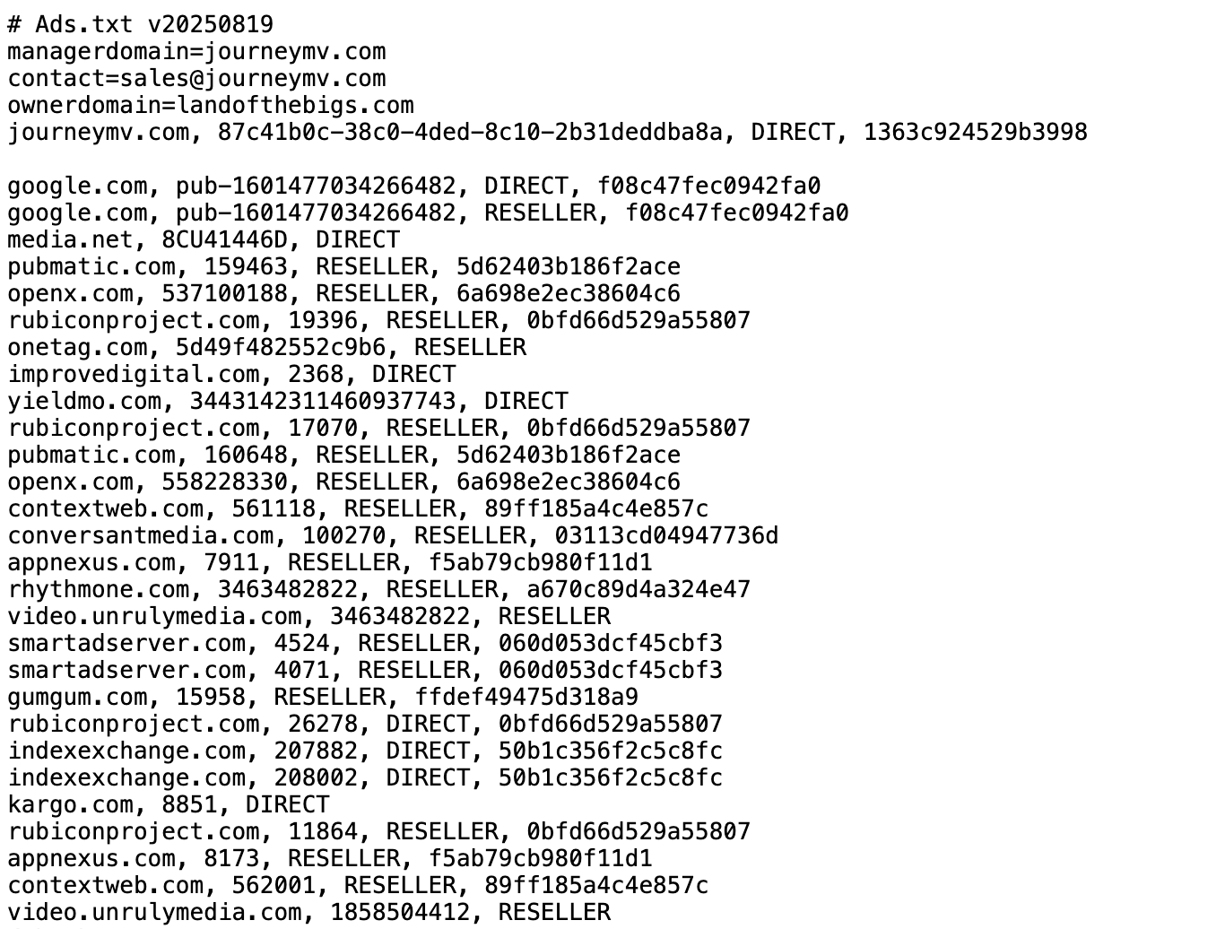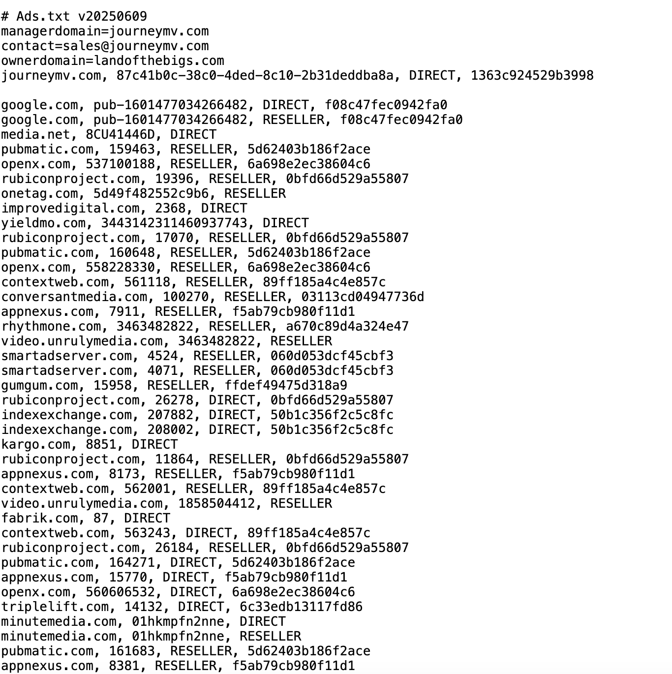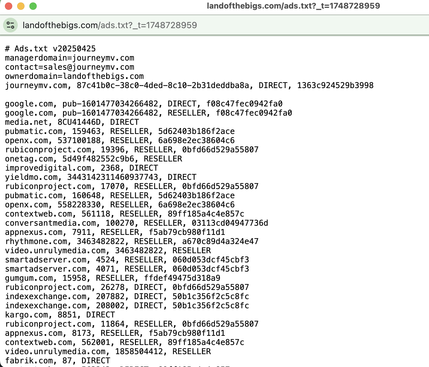 I checked your ads.txt file this morning, and we're no longer seeing a Journey ads.txt file on your site0