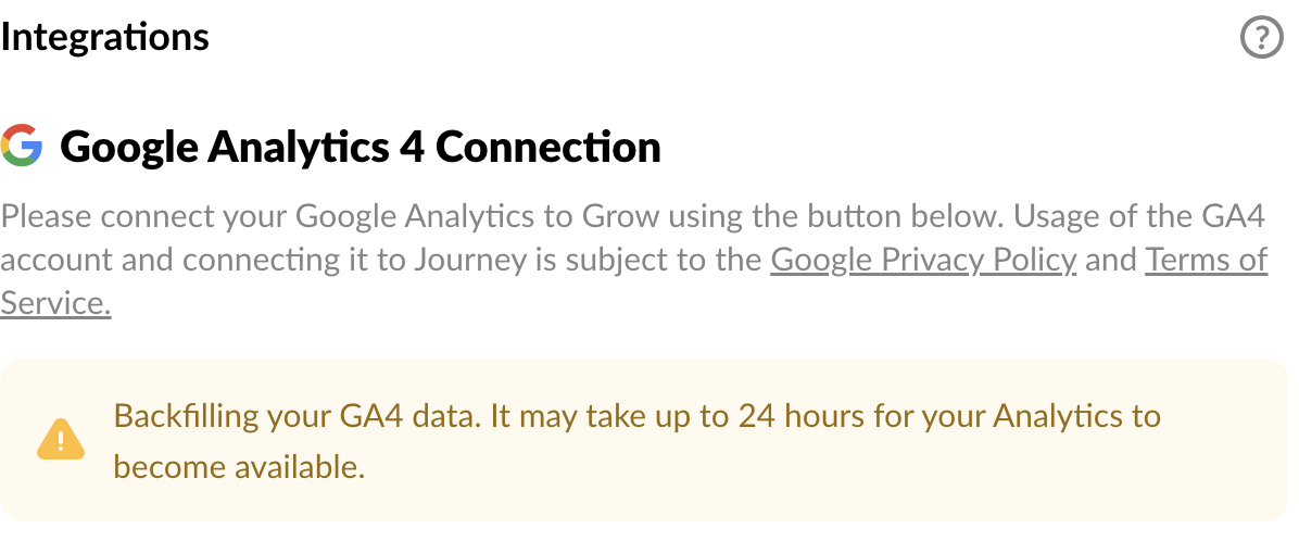 Please, I have connected the GA4 of my website to my Grow account, but it never connects. I tried many times to disconnect and connect again, last time was on the 4th July, but I still see the same message: “Backfilling your GA4 data. It may take up to 24 hours for your Analytics to become available,” even more than 10 days after.