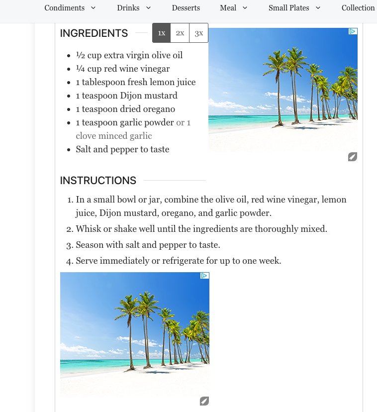 Hi, I used to add recipes with a plugin on my site, and ads displayed fine inside the recipe. But now I’ve added the recipes with the code, and the ads no longer appear within the recipe. Is there a way to get ads to show inside the recipe again?