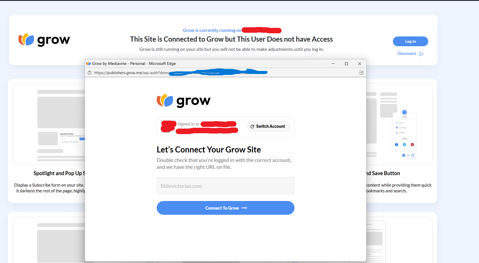 I am logged in with the only email account in my Grow account. It works fine for a few hours and I can access everything, then I suddenly get this message saying that the site is connected to Grow, but this user doesn't have access…which isn't true. I will log out and try over and over, and it's usually about a month or two and it will randomly start working again.
