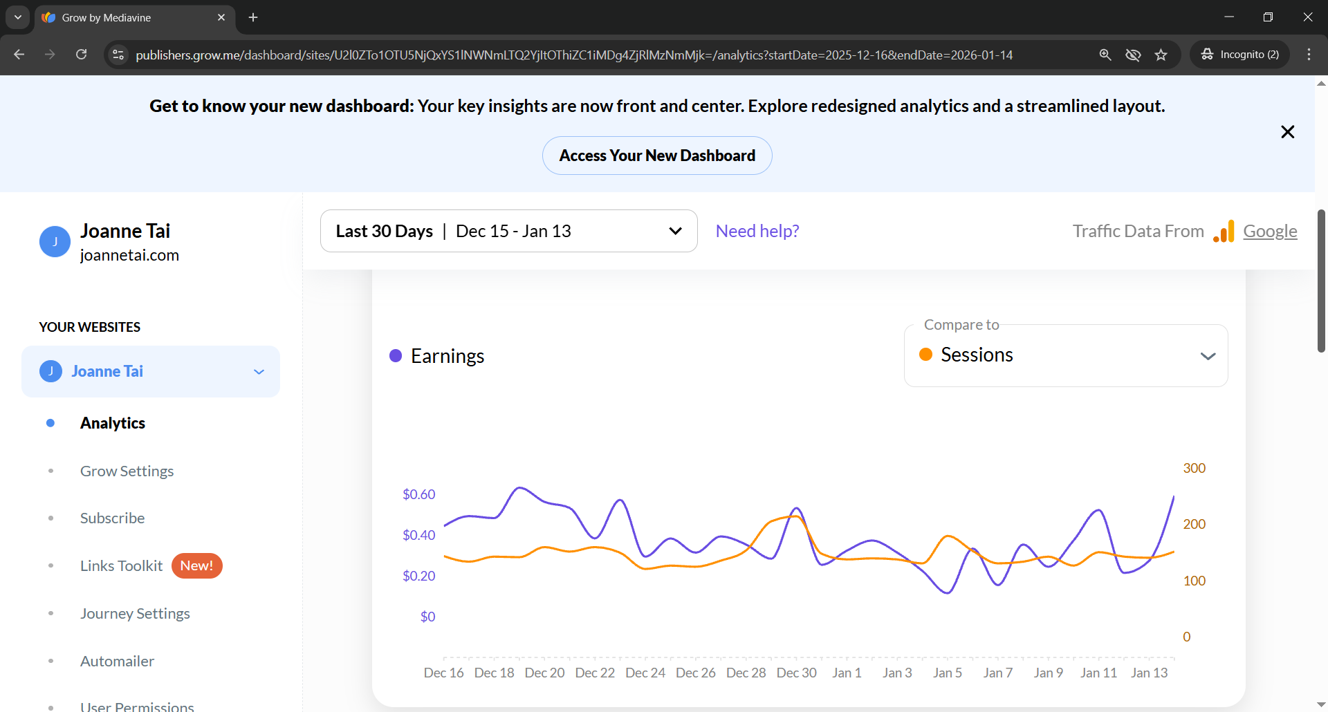 Joanne T — Let's start with your Analytics. Could you please access your Journey dashboard (https://publishers.grow.me/) in a new incognito browser window and send me a screenshot of what you're seeing? Please include the URL of the site that you're looking at as well.