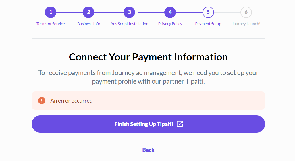 I’m unable to get past the Tipalti page during the initial setup process. After entering my bank information and proceeding, I briefly see a confirmation message that says “You did it!”, but almost immediately afterward the page loads a generic error message (as shown in the attached screenshot).