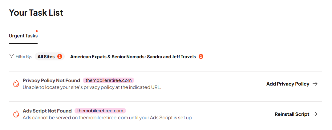 Ads are appearing on my site (though not always) and my privacy policy url is correct but this appears in my Mediavine Dashboard dashboard