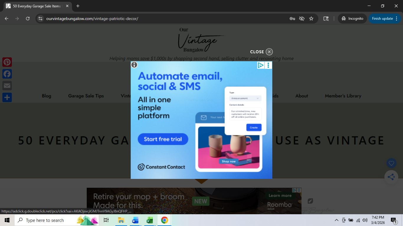 For a long time, I've been getting complaints that pop up ads are completely blocking my webpages. I have verified this on desktop and mobile. It is NOT the video player at the bottom. They are actual pop up ads that completely cover the entire webpage. On desktop it is inconvenient but easy enough to close. On mobile, it is almost impossible to close because you can't navigate to the X to close it, and the entire page is covered with the ad. Again, I have tried it myself, and it is NOT the video ad at the bottom. You can see the video ad playing under this static pop up ad. I have searched all the help articles and community forum, but it hasn't helped.